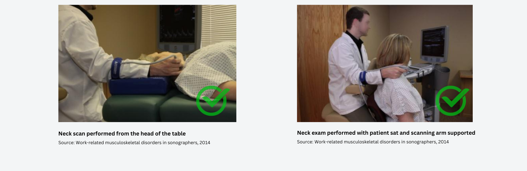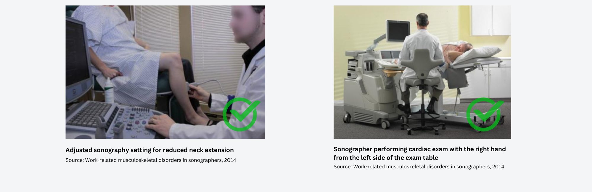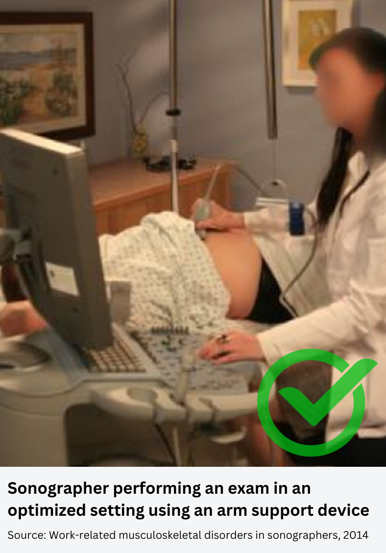 - Biomechanical and environmental factorsΒ including the workstation, equipment, ultrasound system, and the exam room layout. Β