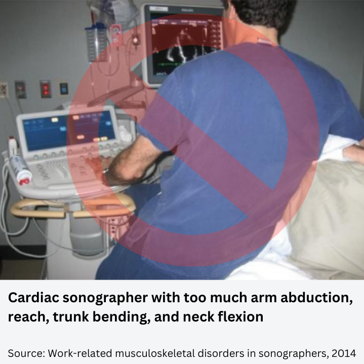 The author of the study published inΒ Reports in Medical ImagingΒ explained that one of the most common static posture sonographers adopt is "abduction of either the scanning arm or the non-scanning arm." According to the same article, an abduction angle greater than 30Β° increases the risk of injury of the shoulder and if the position is maintained for long periods of time, the risk is even higher.