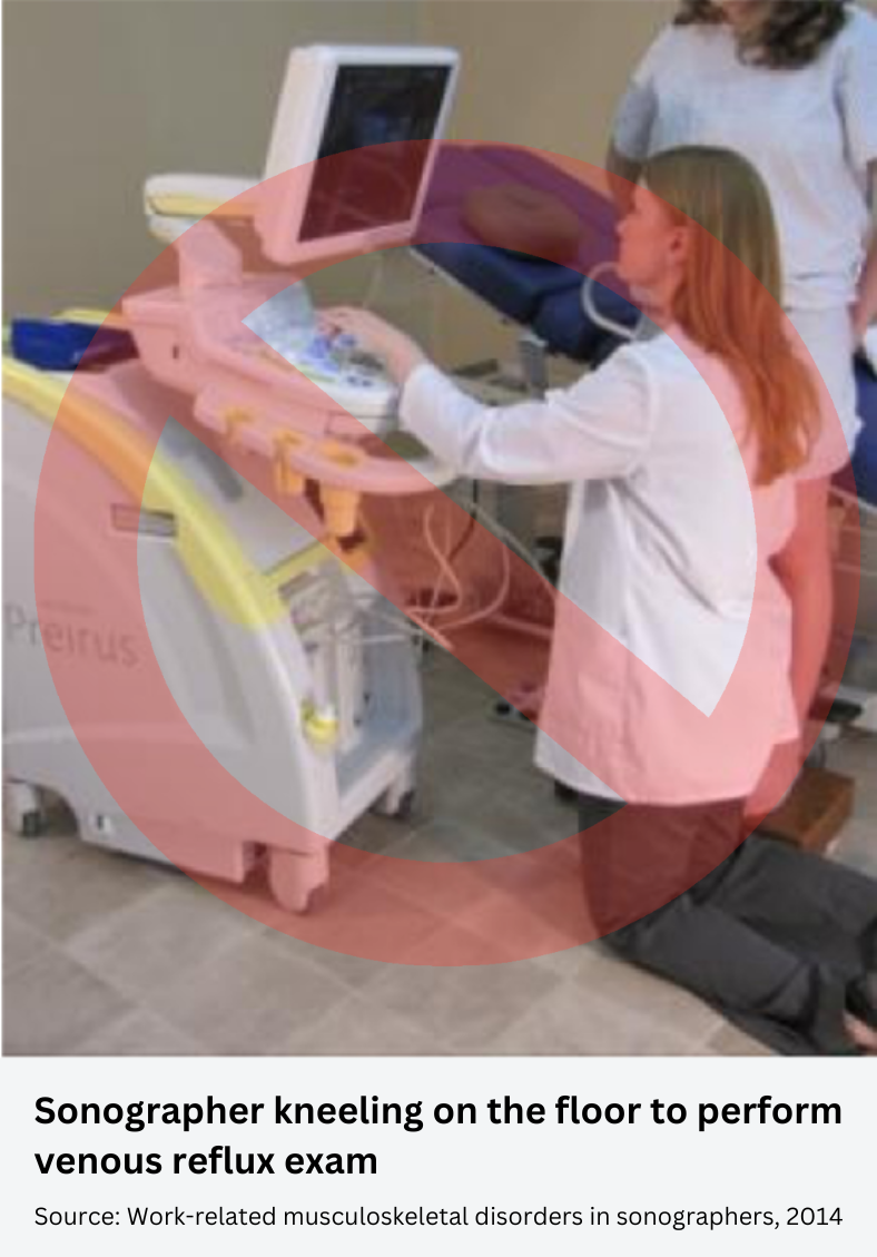 There are some ultrasound examinations, such as venous reflux, that are usually performed by sonographers with the patient standing on the floor or on a stool, forcing the practitioner to sit or kneel on the floor to have access to the scanning area. This posture results in excessive reach, neck tension and trunk twist (Coffin 18).